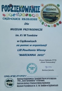 26 marca 202223 marca 2022 roku w Ciężkowicach odbyło się LIII Powitanie Wiosny Marzanna 2022. Impreza składała się z czterech części: wycieczki pieszej, ogłoszenia wyników na EKO-MARZANNĘ, wręczenia pamiątkowych dyplomów i pucharu dla najliczniejszej drużyny na Złazie, ogniska. Część piesza była podzielona na dwa warianty: łatwiejszy i trudniejszy. Krótsza trasa wiodła przez rezerwat Skamieniałe Miasto – rynek w Ciężkowicach – na teren wokół Muzeum Przyrodniczego. Dłuższa wersja zaczynała się na stacji PKP w Pławnej i wiodła przez „Diable Boisko” – Kąśną Dolną – Skamieniałe Miasto – rynek – do Muzeum Przyrodniczego. Organizatorem imprezy byli: Komisja Krajoznawcza i Turystyki Pieszej przy Oddziale PTTK „Ziemi Tarnowskiej” w Tarnowie, Centrum Kultury i Promocji Gminy Ciężkowice oraz Muzeum Przyrodnicze im. K. i W. Tomków w Ciężkowicach.